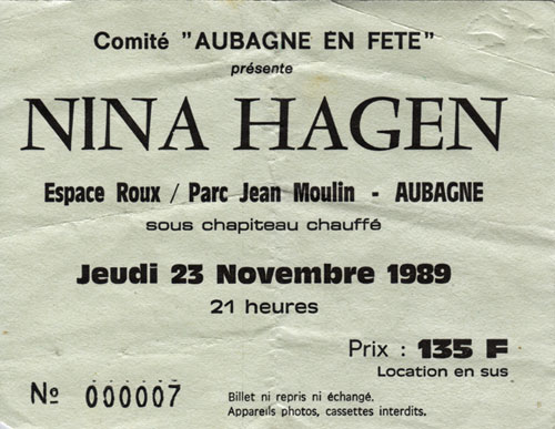 Nina Hagen, Konzertticket Konzert: 23.11.1989, Aubagne, Frankreich, Espace Roux / Parc Jean Moulin "Aubagne en Fete"